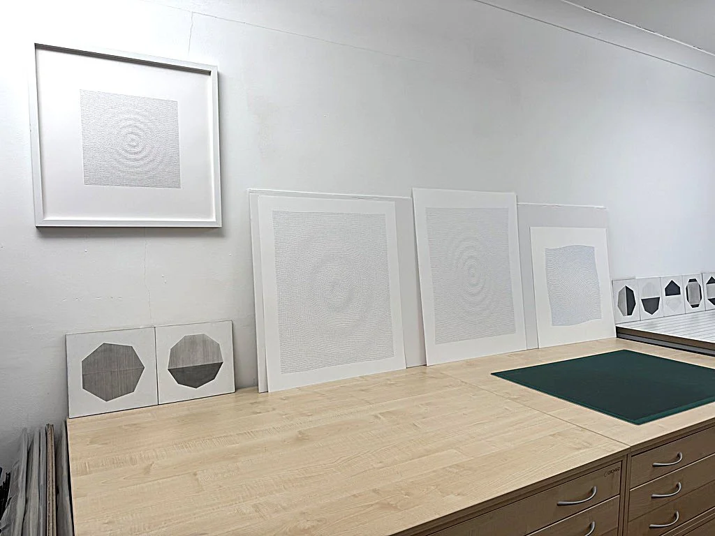 Duncan Bullen has spent many years working almost entirely with pencil and paper. Restricting his mark-making vocabulary to simple dots and lines, he has developed a fascinating and beautiful practice, preferring the stark white of Fabriano 5 paper, with its luminous quality, in which to set his highly reductive drawings. Although these materials are modest and ubiquitous, this ubiquity is a reminder of the limitless potential that they possess. Bullen's exploration of drawing is expansive and ambitious; his execution meticulous and energetic. If the materials are basic and commonplace, the marks, similarly, seem simplistic and foundational. Yet there is something of the transcendent in the finished work, which is seductive; one is drawn in to find a subtlety that is captivating.